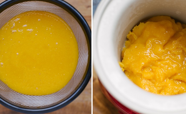 - Tuangkan jus mangga dalam wadah melalui saringan. Ini dilakukan untuk memastikan sudah tidak ada lagi gumpalan.